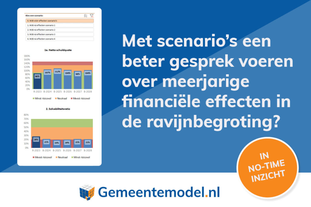 Stel eenvoudig scenario’s op en krijg inzicht in de meerjarige effecten op de financiële positie van jouw gemeente. Handig in de aanloop naar het ravijnjaar!